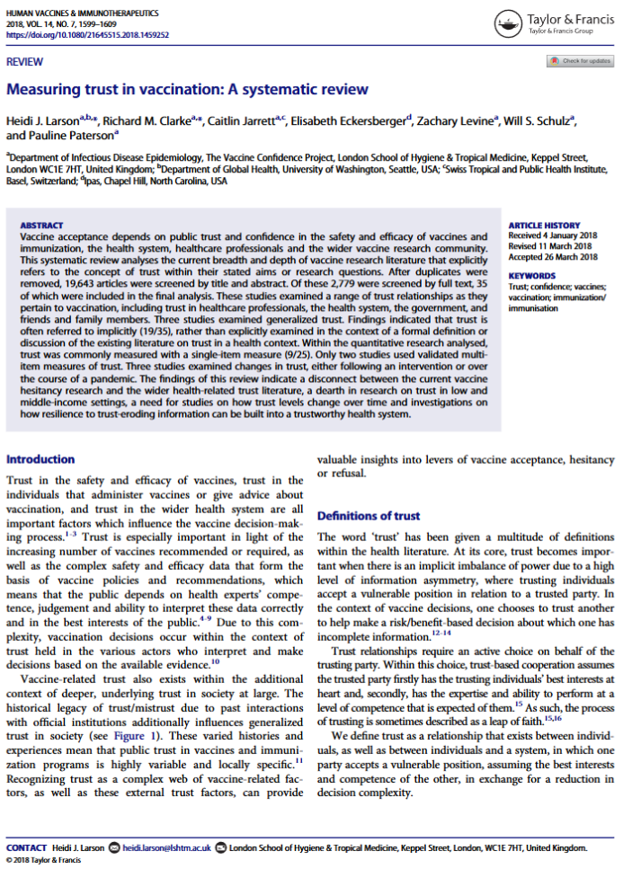 Larson, H. J., Clarke, R. M., Jarrett, C., Eckersberger, E., Levine, Z., Schulz, W. S., & Paterson, P. (2018). Measuring trust in vaccination: A systematic review. Human vaccines & immunotherapeutics, 14(7), 1599-1609.
