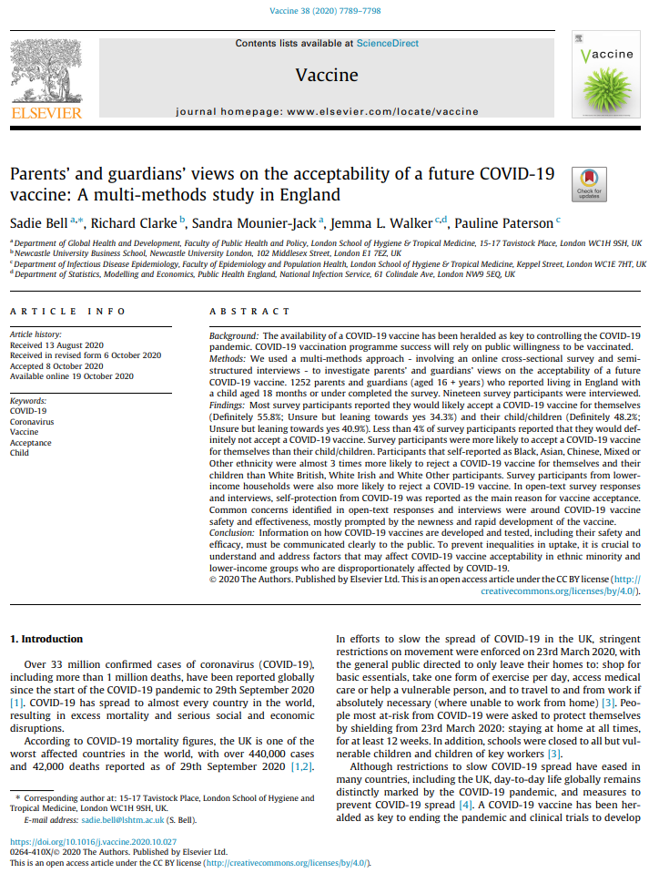 Bell, S., Clarke, R., Mounier-Jack, S., Walker, J. L., & Paterson, P. (2020). Parents’ and guardians’ views on the acceptability of a future COVID-19 vaccine: A multi-methods study in England. Vaccine, 38(49), 7789-7798.