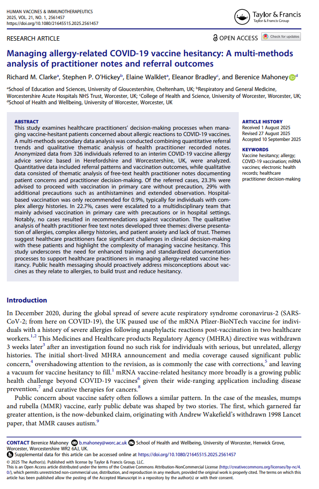 This blog post is based on Clarke et al. (2025). Managing allergy-related COVID-19 vaccine hesitancy: A multi-methods analysis of practitioner notes and referral outcomes. Click the link to read the full open access paper.