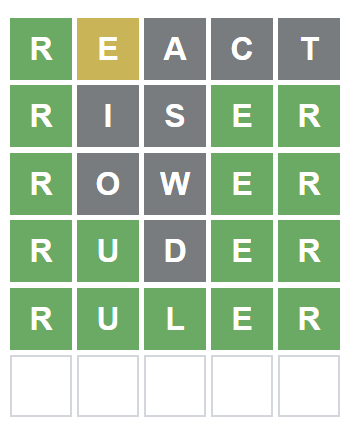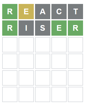 In this case we know that the word starts with an R, there is an E somewhere in the word and A, C and T are not in the word.